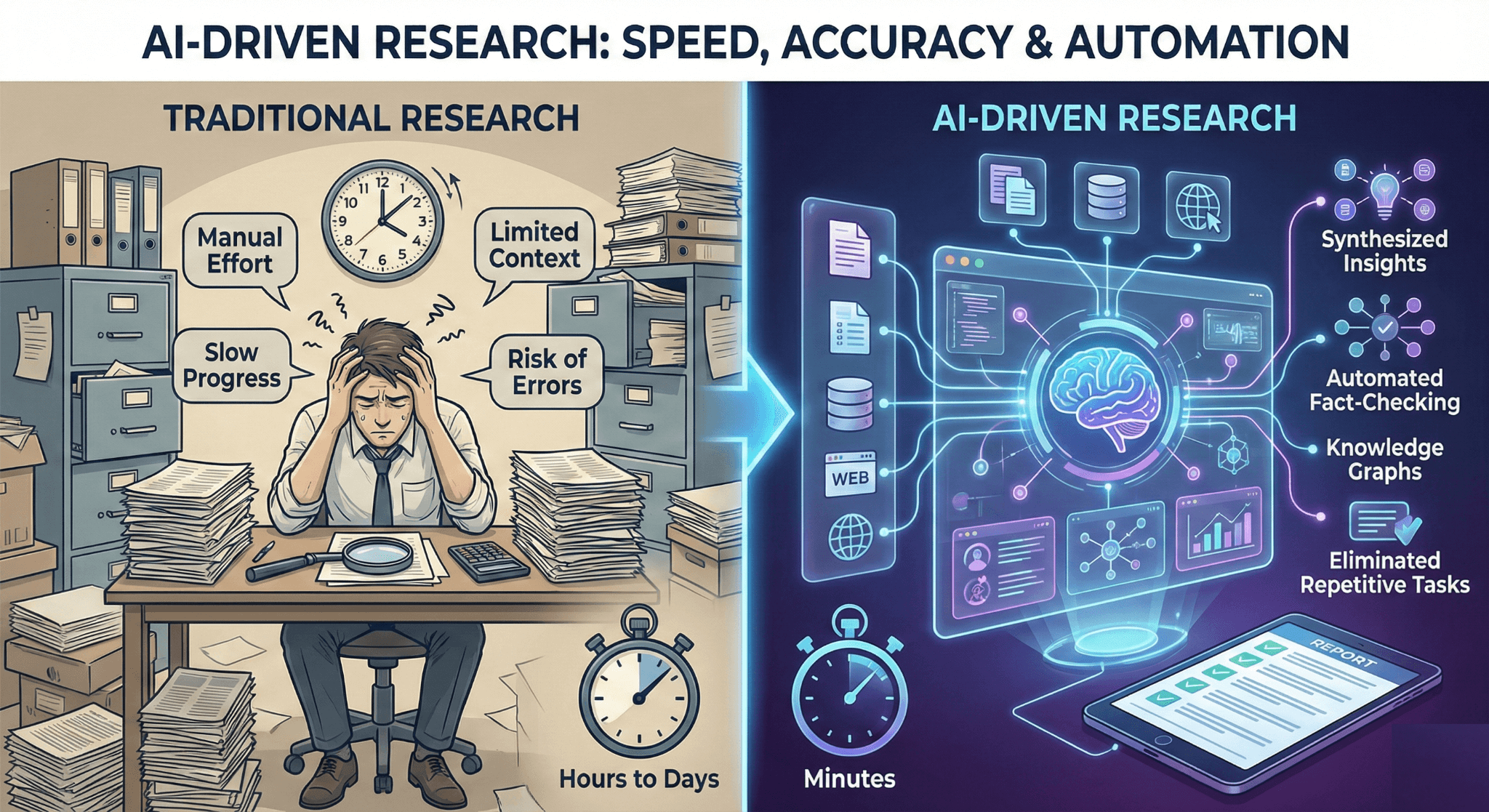 The old way of research involved manual searching, filtering, analyzing, and compiling. AI automates all of this.